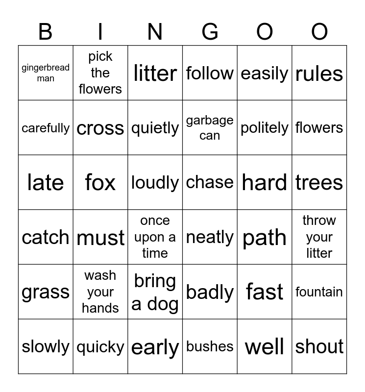 This bingo card has 36 words: badly, bring a dog, bushes, carefully, catch, chase, cross, early, easily, fast, flowers, follow, fountain, fox, garbage can, gingerbread man, grass, hard, late, litter, loudly, must, neatly, once upon a time, path, pick the flowers, politely, quicky, quietly, rules, shout, slowly, throw your litter, trees, wash your hands and well.
