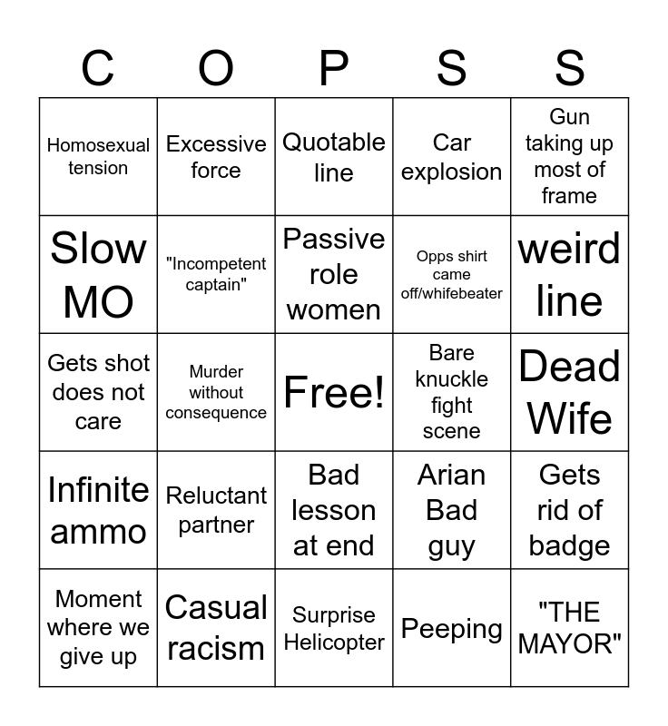 This bingo card has a free space and 24 words: Reluctant partner, Casual racism, Passive role women, Moment where we give up, Gun taking up most of frame, Homosexual tension, Slow MO, Excessive force, Bare knuckle fight scene, Bad lesson at end, Opps shirt came off/whifebeater, Gets shot does not care, Arian Bad guy, Gets rid of badge, "Incompetent captain", Peeping, Dead Wife, Quotable line, weird line, Murder without consequence, "THE MAYOR", Infinite ammo, Car explosion and Surprise Helicopter.