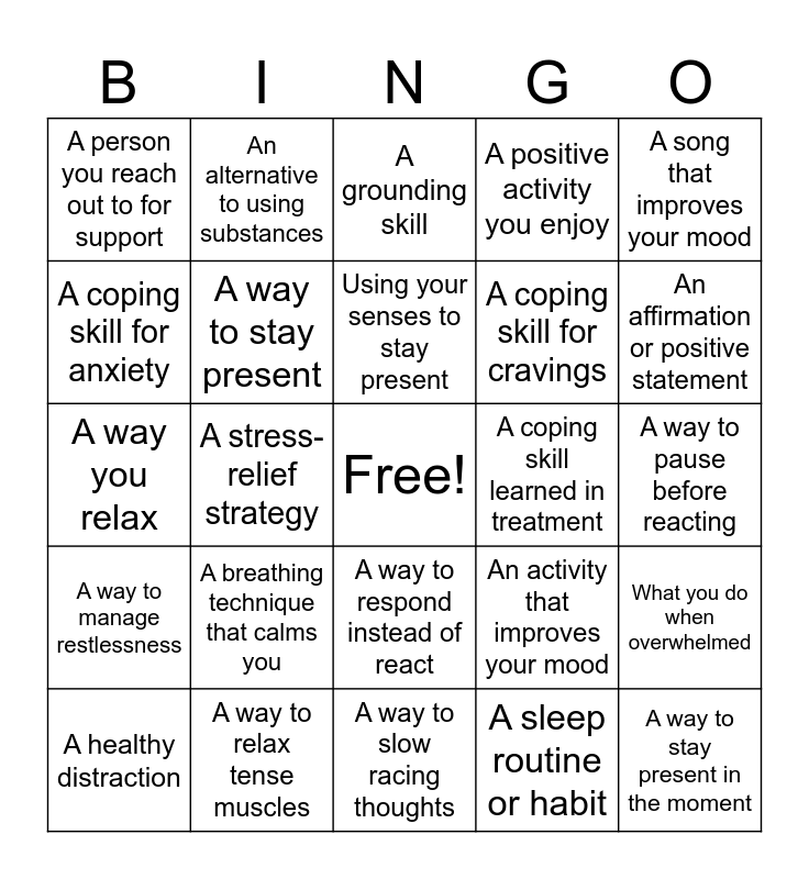 This bingo card has a free space and 24 words: A breathing technique that calms you, A way to relax tense muscles, Using your senses to stay present, A healthy distraction, A song that improves your mood, A person you reach out to for support, A coping skill for anxiety, An alternative to using substances, A coping skill learned in treatment, A way to respond instead of react, A coping skill for cravings, A way you relax, An activity that improves your mood, What you do when overwhelmed, A way to stay present, A sleep routine or habit, A way to pause before reacting, A grounding skill, An affirmation or positive statement, A stress-relief strategy, A way to stay present in the moment, A way to manage restlessness, A positive activity you enjoy and A way to slow racing thoughts.