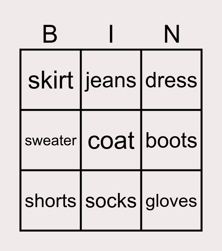 This bingo card has 17 words: hat, trousers, dress, skirt, Free!, sweater, T-shirt, shorts, socks, boots, shoes, scarf, coat, jeans, gloves, jacket and shirt.