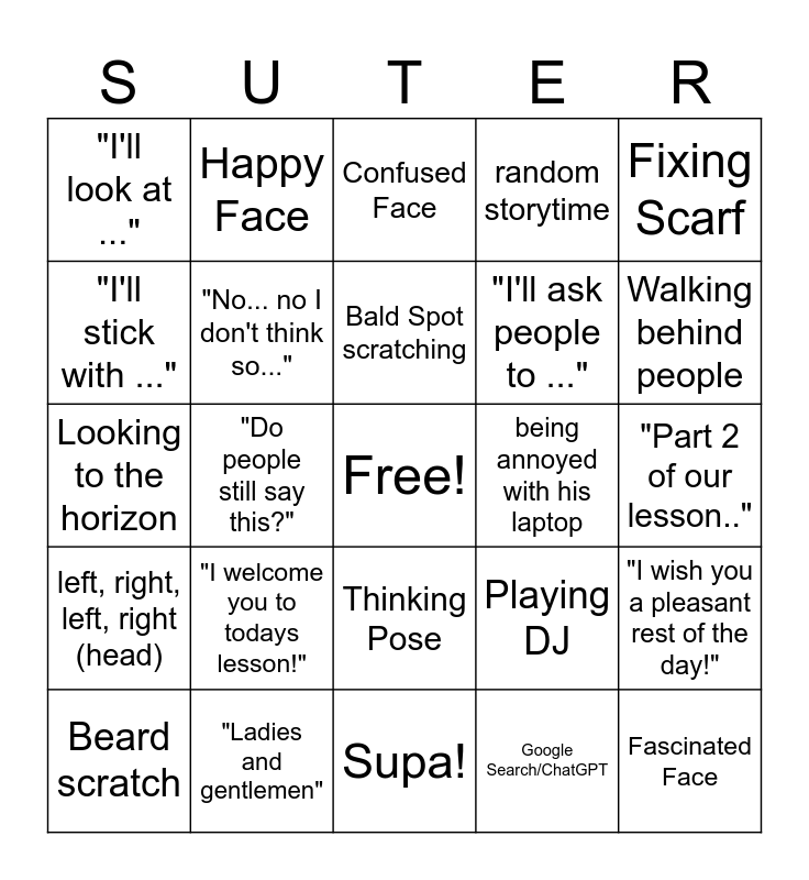 This bingo card has a free space and 24 words: "I welcome you to todays lesson!", "Ladies and gentlemen", Bald Spot scratching, Beard scratch, Fixing Scarf, "I'll look at ...", "I'll stick with ...", Happy Face, being annoyed with his laptop, Thinking Pose, "I'll ask people to ...", Looking to the horizon, Playing DJ, "I wish you a pleasant rest of the day!", "No... no I don't think so...", Google Search/ChatGPT, "Part 2 of our lesson..", Confused Face, Walking behind people, "Do people still say this?", Fascinated Face, left, right, left, right (head), random storytime and Supa!.