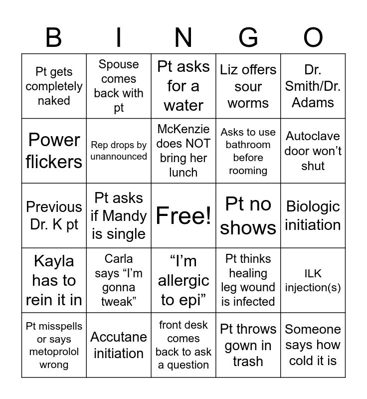 This bingo card has a free space and 34 words: Homeopathic treatment instead, Pt throws gown in trash, Genital Warts, Pt adds hair loss at last minute, Kayla has to rein it in, Rep drops by unannounced, Dr. Smith/Dr. Adams, Pt misspells or says metoprolol wrong, Spouse comes back with pt, Pt brings body map, McKenzie does NOT bring her lunch, Pt asks for a water, Mandy orders Starbucks, "If I could make them go away I’d be rich.”, Pt no shows, Autoclave door won’t shut, Accutane initiation, Previous Dr. K pt, Carla says “I’m gonna tweak”, Pt thinks healing leg wound is infected, “I’m allergic to epi”, Pt asks you how to use their phone, Pt gets completely naked, Biologic initiation, front desk comes back to ask a question, Someone says how cold it is, Liz offers sour worms, You hear Carly laughing <3, Asks to use bathroom before rooming, Power flickers, Pt requests steroid or antibiotic, Pt asks if Mandy is single, ILK injection(s) and Someone announces their pregnant.
