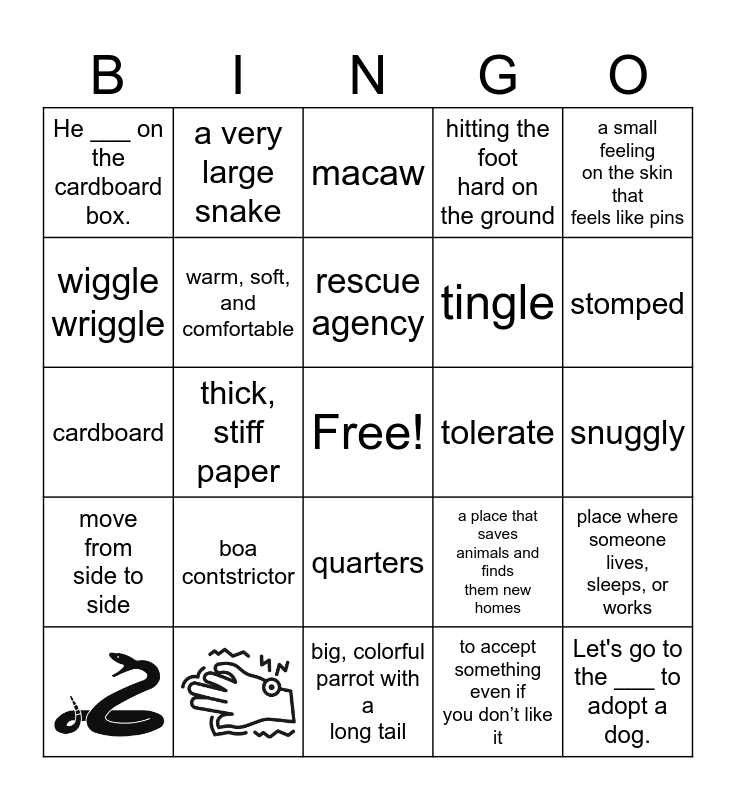 This bingo card has 2 images, a free space and 22 words: boa contstrictor, rescue agency, a small feeling on the skin that feels like pins, He ___ on the cardboard box., wiggle wriggle, a very large snake, tolerate, quarters, tingle, cardboard, a place that saves animals and finds them new homes, place where someone lives, sleeps, or works, warm, soft, and comfortable, to accept something even if you don’t like it, snuggly, macaw, stomped, thick, stiff paper, Let's go to the ___ to adopt a dog., move from side to side, hitting the foot hard on the ground and big, colorful parrot with a long tail.
