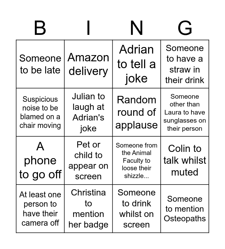 This bingo card has 16 words: Christina to mention her badge, Colin to talk whilst muted, Adrian to tell a joke, Someone to be late, A phone to go off, Amazon delivery, Someone from the Animal Faculty to loose their shizzle..., Someone to drink whilst on screen, Suspicious noise to be blamed on a chair moving, Julian to laugh at Adrian's joke, At least one person to have their camera off, Someone to have a straw in their drink, Pet or child to appear on screen, Someone other than Laura to have sunglasses on their person, Random round of applause and Someone to mention Osteopaths.