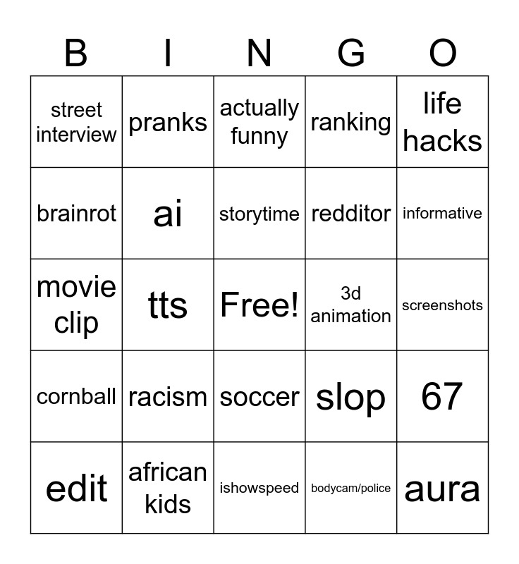 This bingo card has a free space and 24 words: racism, african kids, storytime, edit, life hacks, street interview, brainrot, pranks, 3d animation, soccer, redditor, movie clip, slop, 67, ai, bodycam/police, screenshots, actually funny, informative, tts, aura, cornball, ranking and ishowspeed.