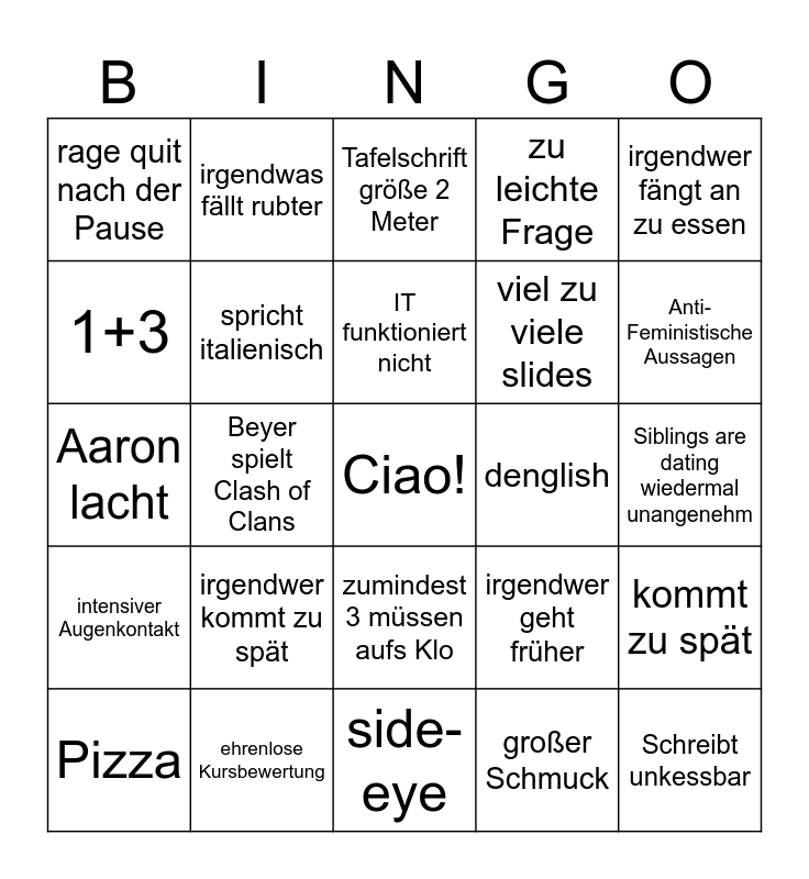 This bingo card has a free space and 24 words: irgendwer kommt zu spät, ehrenlose Kursbewertung, IT funktioniert nicht, Pizza, irgendwer fängt an zu essen, rage quit nach der Pause, 1+3, irgendwas fällt rubter, denglish, zumindest 3 müssen aufs Klo, viel zu viele slides, Aaron lacht, irgendwer geht früher, kommt zu spät, spricht italienisch, großer Schmuck, Siblings are dating wiedermal unangenehm, Tafelschrift größe 2 Meter, Anti-Feministische Aussagen, Beyer spielt Clash of Clans, Schreibt unkessbar, intensiver Augenkontakt, zu leichte Frage and side-eye.
