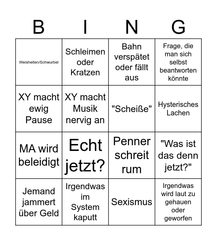 This bingo card has 16 words: Jemand jammert über Geld, Irgendwas im System kaputt, Bahn verspätet oder fällt aus, Frage, die man sich selbst beantworten könnte, XY macht ewig Pause, Schleimen oder Kratzen, Penner schreit rum, "Was ist das denn jetzt?", Weisheiten/Schwurbel, XY macht Musik nervig an, Sexismus, Hysterisches Lachen, MA wird beleidigt, Echt jetzt?, "Scheiße" and Irgendwas wird laut zu gehauen oder geworfen.