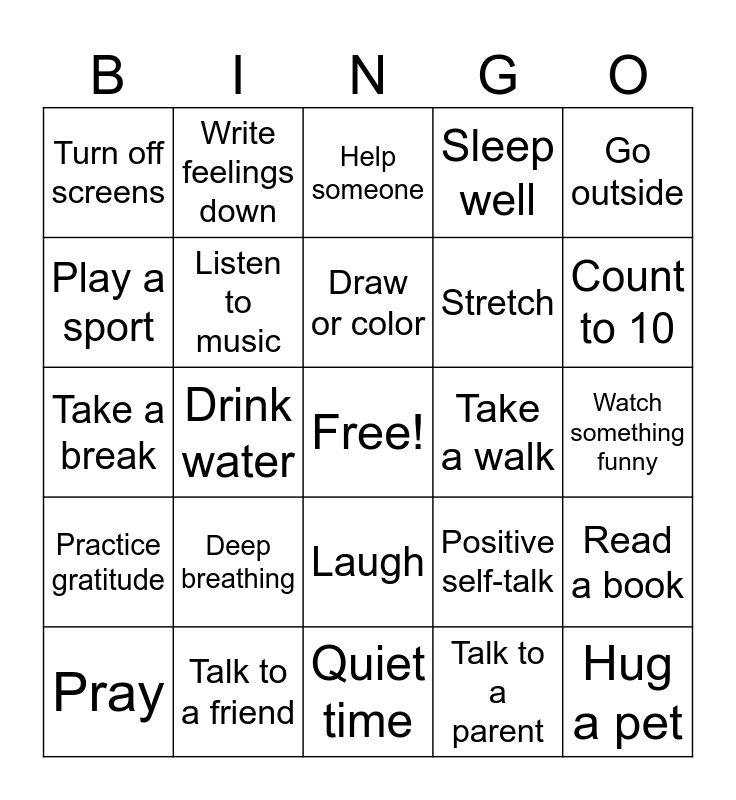 This bingo card has a free space and 24 words: Deep breathing, Talk to a friend, Draw or color, Pray, Go outside, Turn off screens, Play a sport, Write feelings down, Take a walk, Laugh, Stretch, Take a break, Positive self-talk, Read a book, Listen to music, Talk to a parent, Watch something funny, Help someone, Count to 10, Drink water, Hug a pet, Practice gratitude, Sleep well and Quiet time.