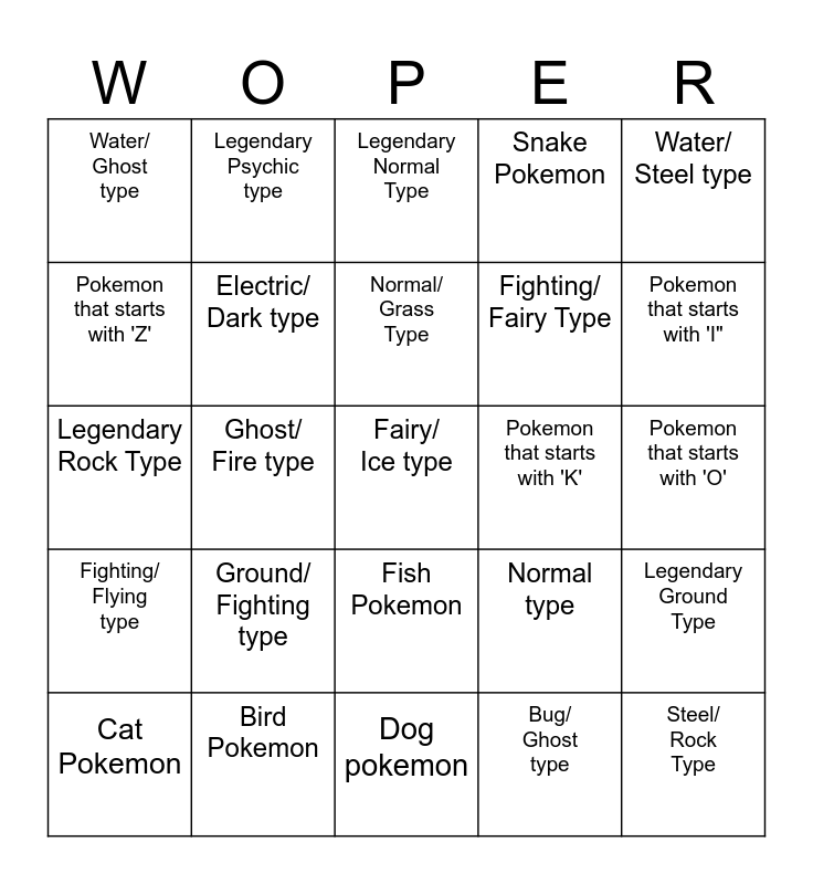 This bingo card has 25 words: Ground/ Fighting type, Dog pokemon, Normal/ Grass Type, Cat Pokemon, Water/ Steel type, Water/ Ghost type, Pokemon that starts with 'Z', Legendary Psychic type, Pokemon that starts with 'K', Fish Pokemon, Fighting/ Fairy Type, Legendary Rock Type, Normal type, Legendary Ground Type, Electric/ Dark type, Steel/ Rock Type, Pokemon that starts with 'O', Legendary Normal Type, Pokemon that starts with 'I", Ghost/ Fire type, Fairy/ Ice type, Bird Pokemon, Fighting/ Flying type, Snake Pokemon and Bug/ Ghost type.