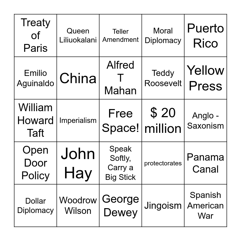 This bingo card has a free space and 24 words: John Hay, Woodrow Wilson, Alfred T Mahan, Dollar Diplomacy, Puerto Rico, Treaty of Paris, Emilio Aguinaldo, Queen Liliuokalani, $ 20 million, Speak Softly, Carry a Big Stick, Teddy Roosevelt, William Howard Taft, protectorates, Panama Canal, China, Jingoism, Anglo - Saxonism, Teller Amendment, Yellow Press, Imperialism, Spanish American War, Open Door Policy, Moral Diplomacy and George Dewey.