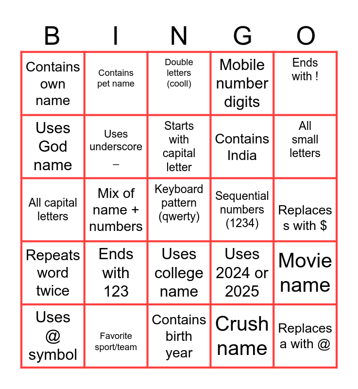 This bingo card has 25 words: Ends with 123, Contains birth year, Starts with capital letter, Uses @ symbol, Ends with !, Contains own name, Uses God name, Contains pet name, Sequential numbers (1234), Uses college name, Contains India, All capital letters, Uses 2024 or 2025, Movie name, Uses underscore _, Replaces a with @, Replaces s with $, Double letters (cooll), All small letters, Mix of name + numbers, Keyboard pattern (qwerty), Favorite sport/team, Repeats word twice, Mobile number digits and Crush name.