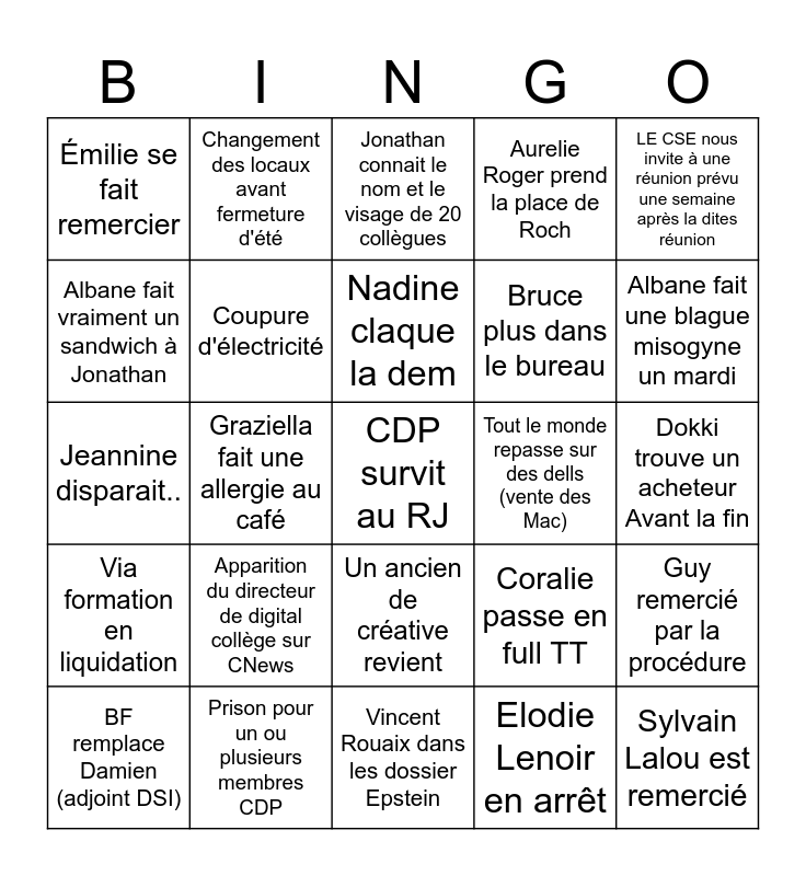 This bingo card has a free space and 24 words: Apparition du directeur de digital collège sur CNews, Prison pour un ou plusieurs membres CDP, Nadine claque la dem, BF remplace Damien (adjoint DSI), LE CSE nous invite à une réunion prévu une semaine après la dites réunion, Émilie se fait remercier, Albane fait vraiment un sandwich à Jonathan, Changement des locaux avant fermeture d'été, Tout le monde repasse sur des dells (vente des Mac), Un ancien de créative revient, Bruce plus dans le bureau, Jeannine disparait.., Coralie passe en full TT, Guy remercié par la procédure, Coupure d'électricité, Elodie Lenoir en arrêt, Dokki trouve un acheteur Avant la fin, Jonathan connait le nom et le visage de 20 collègues, Albane fait une blague misogyne un mardi, Graziella fait une allergie au café, Sylvain Lalou est remercié, Via formation en liquidation, Aurelie Roger prend la place de Roch and Vincent Rouaix dans les dossier Epstein.