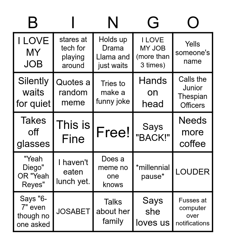 This bingo card has a free space and 24 words: I haven't eaten lunch yet., JOSABET, Tries to make a funny joke, Says "6-7" even though no one asked, Yells someone's name, I LOVE MY JOB, Silently waits for quiet, stares at tech for playing around, Says "BACK!", Does a meme no one knows, Hands on head, Takes off glasses, *millennial pause*, LOUDER, Quotes a random meme, Says she loves us, Needs more coffee, Holds up Drama Llama and just waits, Calls the Junior Thespian Officers, This is Fine, Fusses at computer over notifications, "Yeah Diego" OR "Yeah Reyes", I LOVE MY JOB (more than 3 times) and Talks about her family.