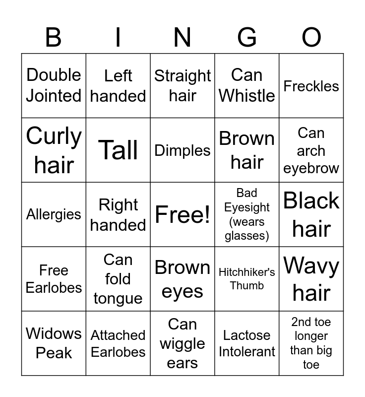 This bingo card has a free space and 24 words: Can fold tongue, Attached Earlobes, Dimples, Widows Peak, Freckles, Double Jointed, Curly hair, Left handed, Bad Eyesight (wears glasses), Brown eyes, Brown hair, Allergies, Hitchhiker's Thumb, Wavy hair, Tall, Lactose Intolerant, Black hair, Straight hair, Can arch eyebrow, Right handed, 2nd toe longer than big toe, Free Earlobes, Can Whistle and Can wiggle ears.