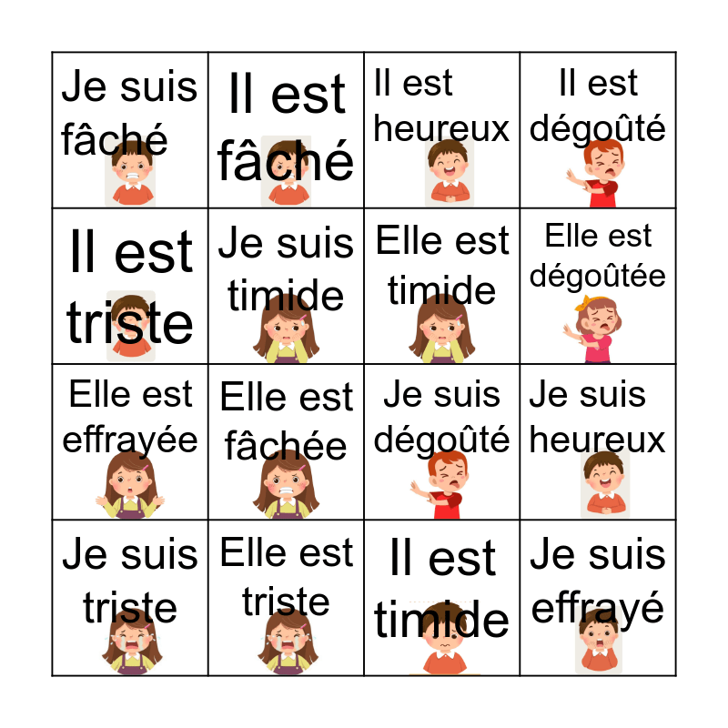 This bingo card has 20 images and 20 words: Je suis heureux, Je suis heureuse, Il est heureux, Elle est heureuse, Je suis triste, Il est triste, Elle est triste, Je suis fâché, Elle est effrayée, Il est fâché, Elle est fâchée, Je suis dégoûté, Je suis timide, Je suis effrayé, Elle est timide, Il est effrayé, Elle est dégoûtée, Il est dégoûté, Il est timide and Je suis effrayée.