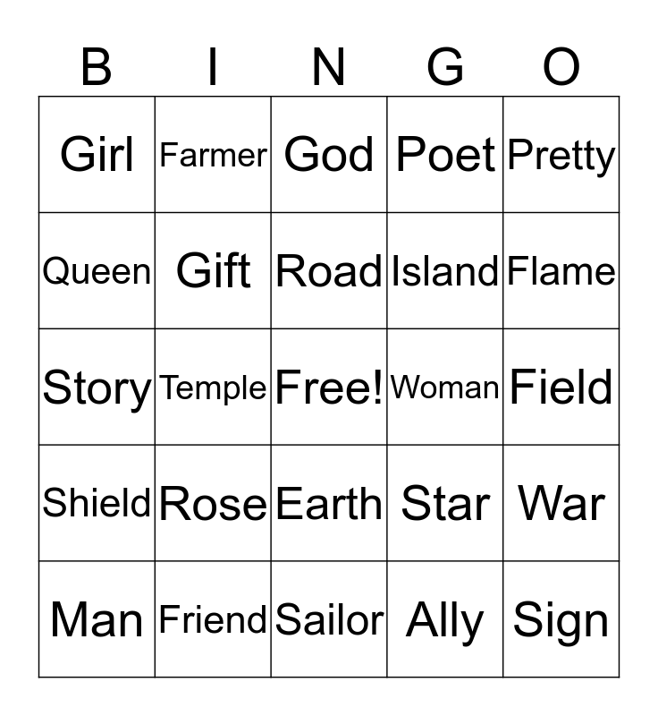 This bingo card has a free space and 24 words: Rose, Friend, Road, Man, Pretty, Girl, Queen, Farmer, Woman, Earth, Island, Story, Star, War, Gift, Ally, Field, God, Flame, Temple, Sign, Shield, Poet and Sailor.