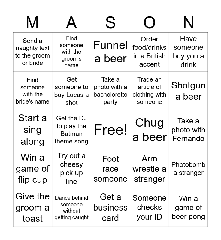This bingo card has a free space and 24 words: Try out a cheesy pick up line, Dance behind someone without getting caught, Take a photo with a bachelorette party, Give the groom a toast, Have someone buy you a drink, Send a naughty text to the groom or bride, Find someone with the bride's name, Find someone with the groom's name, Chug a beer, Foot race someone, Trade an article of clothing with someone, Start a sing along, Arm wrestle a stranger, Photobomb a stranger, Get someone to buy Lucas a shot, Someone checks your ID, Take a photo with Fernando, Funnel a beer, Shotgun a beer, Get the DJ to play the Batman theme song, Win a game of beer pong, Win a game of flip cup, Order food/drinks in a British accent and Get a business card.