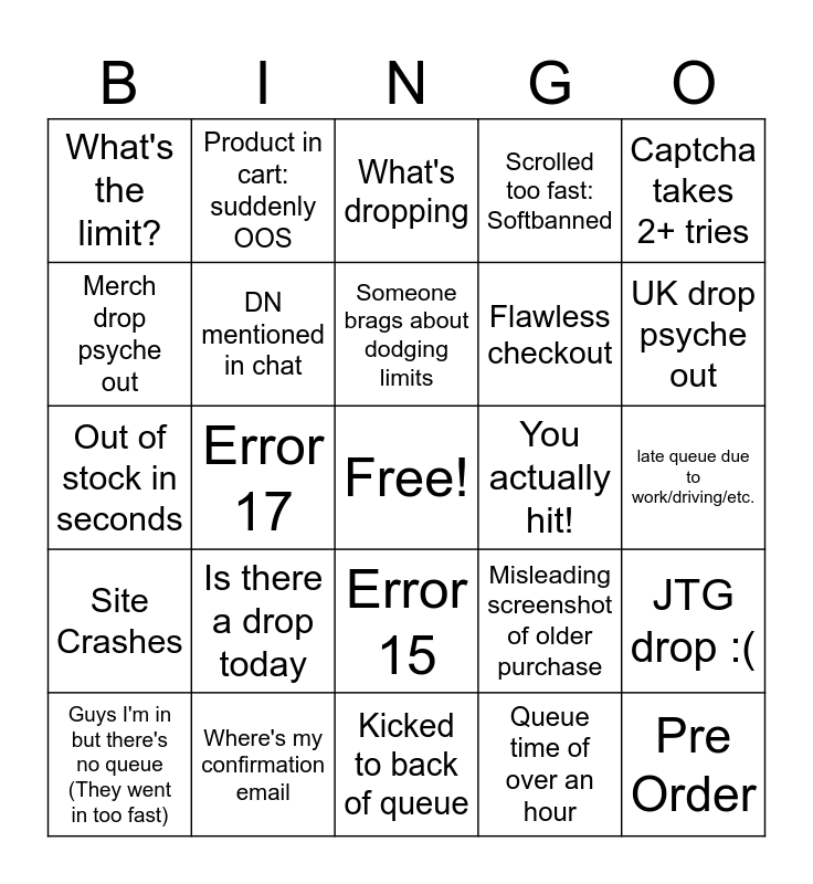 This bingo card has a free space and 24 words: Is there a drop today, Where's my confirmation email, Someone brags about dodging limits, Guys I'm in but there's no queue (They went in too fast), Captcha takes 2+ tries, What's the limit?, Merch drop psyche out, Product in cart: suddenly OOS, You actually hit!, Error 15, Flawless checkout, Out of stock in seconds, Misleading screenshot of older purchase, JTG drop :(, DN mentioned in chat, Queue time of over an hour, late queue due to work/driving/etc., What's dropping, UK drop psyche out, Error 17, Pre Order, Site Crashes, Scrolled too fast: Softbanned and Kicked to back of queue.