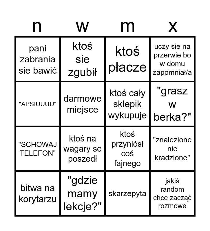 This bingo card has 16 words: "gdzie mamy lekcje?", "znalezione nie kradzione", ktoś płacze, pani zabrania sie bawić, "SCHOWAJ TELEFON", ktoś sie zgubił, ktoś przyniósł coś fajnego, skarzepyta, "APSIUUUU", darmowe miejsce, bitwa na korytarzu, uczy sie na przerwie bo w domu zapomniał/a, ktoś na wagary se poszedł, "grasz w berka?", ktoś cały sklepik wykupuje and jakiś random chce zacząć rozmowe.