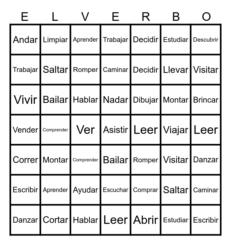 ⚠ This card has duplicate items: Platicar (3), Visitar (3), Asistir (3), Llamar (3), Beber (3), Abrir (3), Tejer (3), Decidir (3), Comprender (3), Estudiar (3), Coser (3), Aprender (3), Llevar (3), Dibujar (3), Ver (3), Cortar (3), Trabajar (3), Describir (3), Pintar (3), Esquiar (3), Manejar (2), Lavar (3), Nadar (3), Escribir (3), Descubrir (3), Andar (3), Correr (3), Barrer (3), Cantar (3), Mirar (3), Subir (3), Montar (3), Saltar (3), Vivir (3), Vender (3), Comprar (3), Escalar (3), Bailar (3), Permitir (3), Romper (3), Limpiar (3), Viajar (3), Brincar (3), Comer (3), Hablar (3), Tocar (3), Caminar (3), Leer (3), Hornear (3), Escuchar (3), Danzar (3), Cocinar (3), Ayudar (3), Compartir (3)