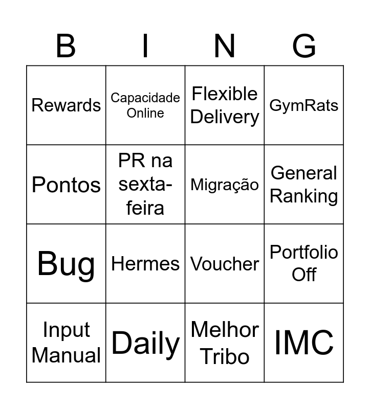 This bingo card has 31 words: Free!, Portfolio On, Portfolio Off, Online Journey, Rewards, Flexible Delivery, Migração, Sprint, Daily, Bees Strategy, Melhor Tribo, Input Manual, Ainda é Carnaval, Day Off, Hermes, Brewdat, Chamado, Missões, IMC, Oferta, Pontos, Club B, Score 5, Capacidade Online, Bug, PR na sexta-feira, GymRats, Voucher, PN, General Ranking and Hard coded.