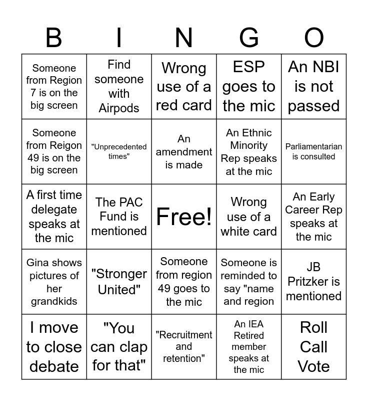 This bingo card has a free space and 29 words: Wrong use of a green card, "You can clap for that", Wrong use of a red card, A question is asked about the budget, An NBI is not passed, Someone from Region 7 is on the big screen, "Unprecedented times", An amendment is made, Wrong use of a white card, JB Pritzker is mentioned, I move to close debate, The PAC Fund is mentioned, An IEA Retired member speaks at the mic, Roll Call Vote, A first time delegate speaks at the mic, There is a standing ovation, "Recruitment and retention", Someone is reminded to say "name and region, Parliamentarian is consulted, Gina shows pictures of her grandkids, "Stronger United", SCORE Grants are mentioned, An Ethnic Minority Rep speaks at the mic, An Early Career Rep speaks at the mic, Someone from Reigon 49 is on the big screen, Find someone with Airpods, Someone from region 49 goes to the mic, ESP goes to the mic and Eugene speaks at the Mic.
