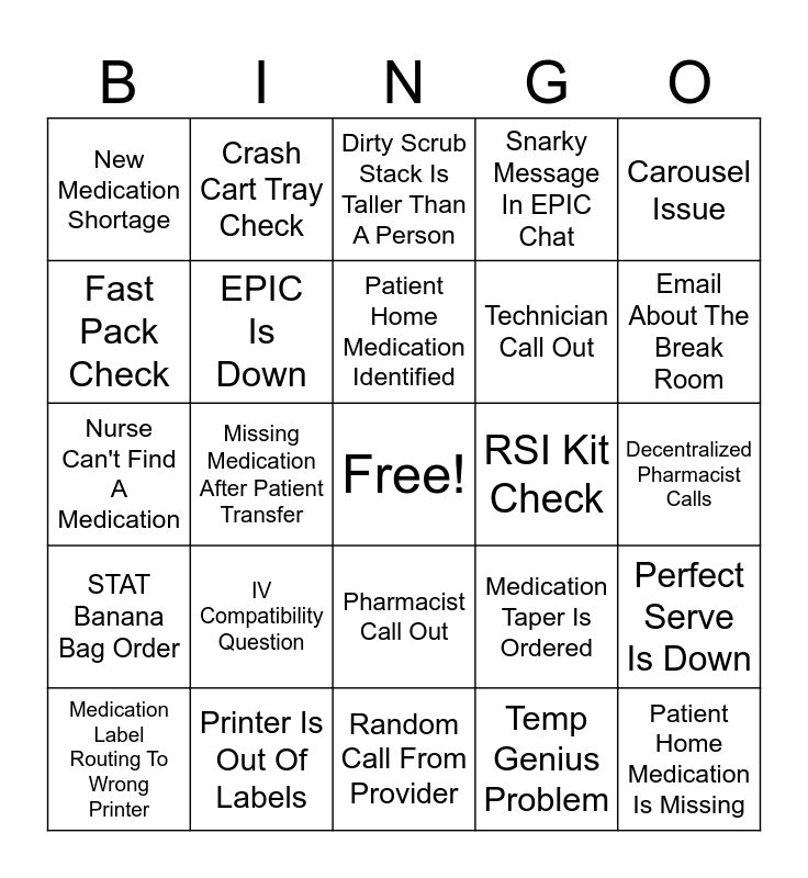 This bingo card has a free space and 24 words: IV Compatibility Question, Printer Is Out Of Labels, Patient Home Medication Identified, Medication Label Routing To Wrong Printer, Carousel Issue, New Medication Shortage, Fast Pack Check, Crash Cart Tray Check, RSI Kit Check, Pharmacist Call Out, Technician Call Out, Nurse Can't Find A Medication, Medication Taper Is Ordered, Perfect Serve Is Down, EPIC Is Down, Temp Genius Problem, Decentralized Pharmacist Calls, Dirty Scrub Stack Is Taller Than A Person, Email About The Break Room, Missing Medication After Patient Transfer, Patient Home Medication Is Missing, STAT Banana Bag Order, Snarky Message In EPIC Chat and Random Call From Provider.