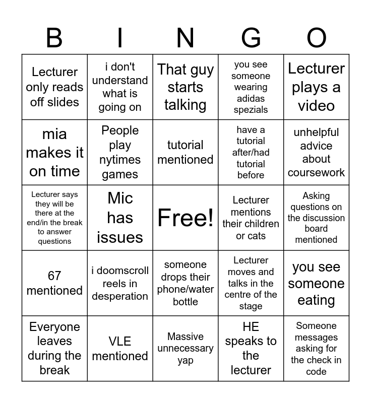 This bingo card has a free space and 29 words: Everyone leaves during the break, Lecturer struggles to use menti, Mic has issues, Lecture finishes at least 10 mins early, Lecturer only reads off slides, That guy starts talking, People play nytimes games, i doomscroll reels in desperation, Lecturer mentions their children or cats, VLE mentioned, Asking questions on the discussion board mentioned, Someone messages asking for the check in code, Massive unnecessary yap, HE speaks to the lecturer, unhelpful advice about coursework, HE sits and aurafarms, someone drops their phone/water bottle, 67 mentioned, Lecturer plays a video, Lecturer says they will be there at the end/in the break to answer questions, Lecturer moves and talks in the centre of the stage, posture is bad and back hurts, have a tutorial after/had tutorial before, mia makes it on time, you see someone wearing adidas spezials, i don't understand what is going on, you see someone eating, tutorial mentioned and optional reading mentioned.