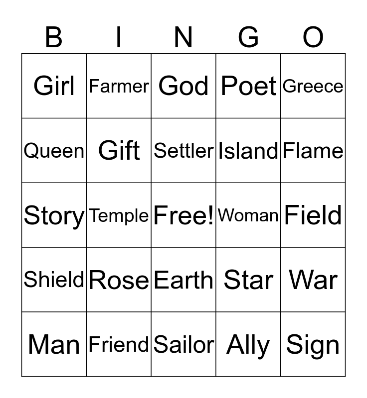 This bingo card has a free space and 24 words: Rose, Friend, Settler, Man, Greece, Girl, Queen, Farmer, Woman, Earth, Island, Story, Star, War, Gift, Ally, Field, God, Flame, Temple, Sign, Shield, Poet and Sailor.