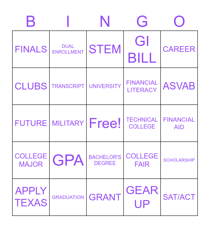 This bingo card has a free space and 43 words: DORMS, SAT/ACT, TUTORS, APPLY TEXAS, RESUME, GEAR UP, STEM, CAMPUS, CAREER, GRADUATION, GI BILL, TECHNICAL COLLEGE, BACHELOR'S DEGREE, GPA, CERTIFICATION, GRANT, TUITUION, FUTURE, LEADERSHIP, ASVAB, DUAL ENROLLMENT, ASSOCIATE'S DEGREE, INTERNSHIP, FINALS, SPORTS, FINANCIAL AID, JOB SKILLS, COLLEGE MINOR, COLLEGE FAIR, COLLEGE MAJOR, PROFESSOR, SCHOLARSHIP, ADVISOR, MILITARY, WORKFORCE, CREDITS, COMMUNITY COLLEGE, UNIVERSITY, CLUBS, FINANCIAL LITERACY, FAFSA, TRANSCRIPT and SUCCESS.