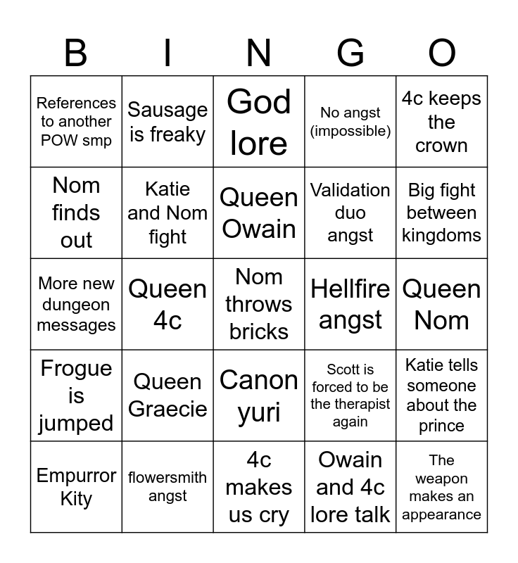 This bingo card has a free space and 24 words: Queen Graecie, flowersmith angst, Queen Owain, Empurror Kity, 4c keeps the crown, References to another POW smp, Nom finds out, Sausage is freaky, Hellfire angst, Canon yuri, Validation duo angst, More new dungeon messages, Scott is forced to be the therapist again, Katie tells someone about the prince, Katie and Nom fight, Owain and 4c lore talk, Queen Nom, God lore, Big fight between kingdoms, Queen 4c, The weapon makes an appearance, Frogue is jumped, No angst (impossible) and 4c makes us cry.