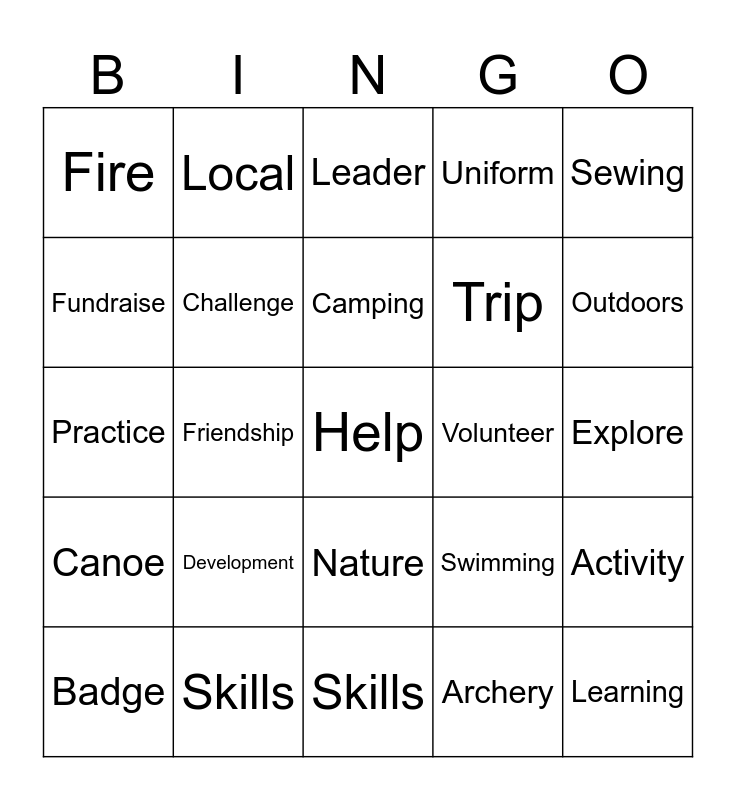 This bingo card has a free space and 29 words: Badge, Community, Friendship, Baking, Fire, Leader, Challenge, Development, Volunteer, Skills, Explore, Learning, Skills, Archery, Outdoors, Bird watching, Nature, Canoe, Sewing, Practice, Swimming, Adventure, Trip, Fundraise, Uniform, Local, Activity, Camping and Team.