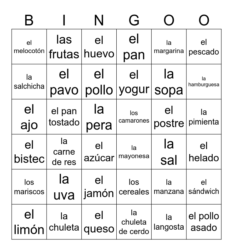 This bingo card has 44 words: el aceite, el ajo, el arroz, el azúcar, los cereales, el helado, el huevo, la mantequilla, la margarina, la mayonesa, el pan, el pan tostado, la pimienta, el postre, el queso, la sal, el sándwich, la sopa, el vinagre, el yogur, las frutas, el limón, la manzana, el melocotón, la naranja, la pera, la uva, el atún, el bistec, los camarones, la carne, la carne de res, la chuleta, la chuleta de cerdo, la hamburguesa, el jamón, la langosta, los mariscos, el pavo, el pescado, el pollo, el pollo asado, la salchicha and el salmón.
