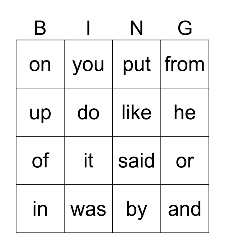 This bingo card has 16 words: was, or, put, on, of, you, said, by, up, do, in, from, it, he, like and and.