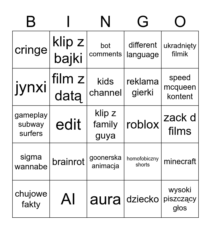 This bingo card has a free space and 24 words: brainrot, AI, kids channel, chujowe fakty, ukradnięty filmik, cringe, jynxi, klip z bajki, roblox, goonerska animacja, reklama gierki, gameplay subway surfers, homofobiczny shorts, minecraft, film z datą, dziecko, zack d films, bot comments, speed mcqueen kontent, edit, wysoki piszczący głos, sigma wannabe, different language and aura.