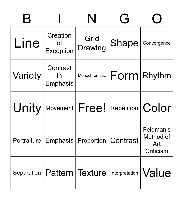 This bingo card has a free space and 34 words: Analysis, Interpretation, Judgement, Juxtaposition, Portraiture, Contrast in Emphasis, Convergence, Separation, Creation of Exception, Subordination, Monochromatic, Grid Drawing, Complementary Colors, The Principles of Design, Repetition, Rhythm, Pattern, Unity, Emphasis, Contrast, Proportion, The Elements of Art, Line, Color, Texture, Value, Shape, Space, Form, Variety, Balance, Movement, Feldman’s Method of Art Criticism and Description.