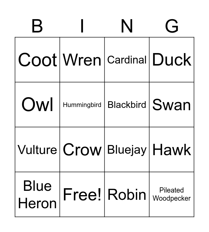 This bingo card has 21 words: Free!, Goldfinch, Wren, Chikadee, Robin, Blackbird, Coot, Cardinal, Bluejay, Swan, Vulture, Duck, Pileated Woodpecker, Bald Eagle, Hummingbird, Pigeon, Blue Heron, Crow, Owl, Hawk and Kingfisher.