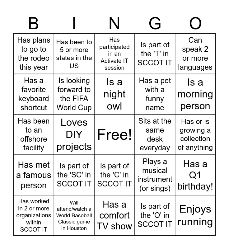 This bingo card has a free space and 24 words: Is part of the 'SC' in SCCOT IT, Will attend/watch a World Baseball Classic game in Houston, Is a night owl, Has worked in 2 or more organizations within SCCOT IT, Can speak 2 or more languages, Has plans to go to the rodeo this year, Has a favorite keyboard shortcut, Has been to 5 or more states in the US, Sits at the same desk everyday, Is part of the 'C' in SCCOT IT, Has a pet with a funny name, Has been to an offshore facility, Plays a musical instrument (or sings), Has a Q1 birthday!, Is looking forward to the FIFA World Cup, Is part of the 'O' in SCCOT IT, Has or is growing a collection of anything, Has participated in an Activate IT session, Is a morning person, Loves DIY projects, Enjoys running, Has met a famous person, Is part of the 'T' in SCCOT IT and Has a comfort TV show.