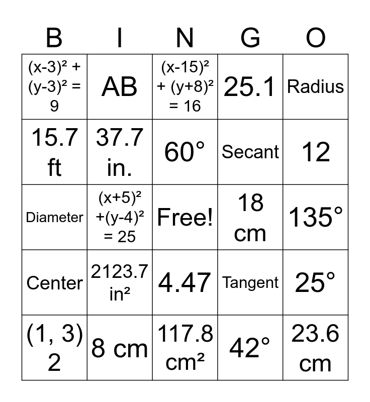 This bingo card has a free space and 29 words: (1, 3) 2, 6, (x+5)² +(y-4)² = 25, (x-5)² + (y+7)² = 49, (x-3)² + (y-3)² = 9, (x-15)² + (y+8)² = 16, 37.7 in., 2123.7 in², 18 cm, 8 cm, 135°, 23.6 cm, 117.8 cm², 42°, 12, 5.5, 4.47, Center, Radius, Diameter, Tangent, Chord, Secant, 15.7 ft, 25.1, AB, 25°, 60° and 5.