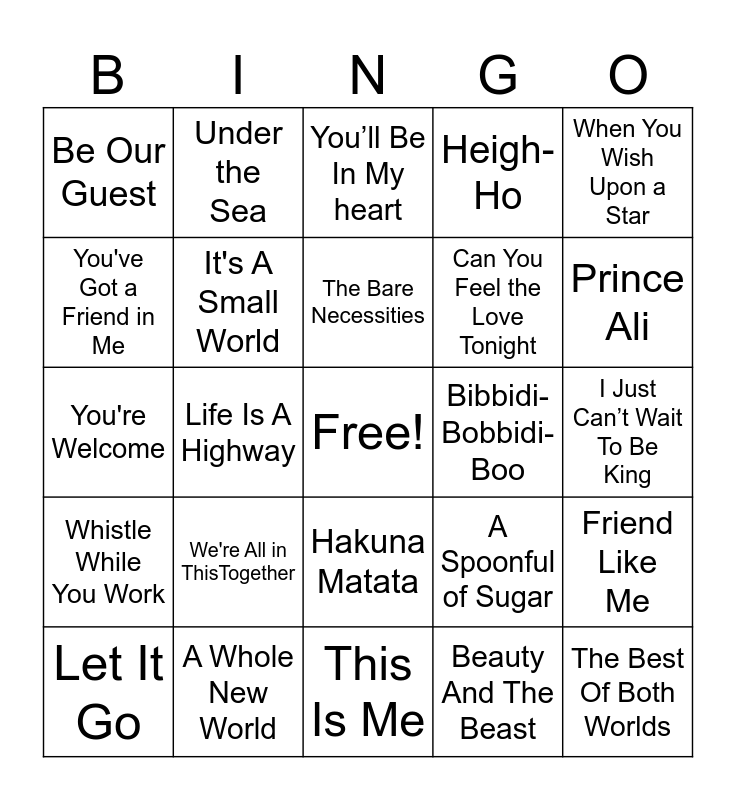 This bingo card has a free space and 24 words: We're All in ThisTogether, A Whole New World, The Bare Necessities, Let It Go, When You Wish Upon a Star, Be Our Guest, You've Got a Friend in Me, Under the Sea, Bibbidi-Bobbidi-Boo, Hakuna Matata, Can You Feel the Love Tonight, You're Welcome, A Spoonful of Sugar, Friend Like Me, It's A Small World, Beauty And The Beast, I Just Can’t Wait To Be King, You’ll Be In My heart, Prince Ali, Life Is A Highway, The Best Of Both Worlds, Whistle While You Work, Heigh-Ho and This Is Me.