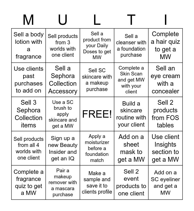 This bingo card has a free space and 24 words: Sign up a new Beauty Insider and get an IQ, Pair a makeup remover with a mascara purchase, Sell SC skincare with a makeup purchase, Complete a fragrance quiz to get a MW, Complete a hair quiz to get a MW, Sell a body lotion with a fragrance, Use clients past purchases to add on, Sell products from 3 worlds with one client, Build a skincare routine with your client, Apply a moisturizer before a foundation match, Complete a Skin Scan and get MW with your client, Sell 3 Sephora Collection items, Add on a sheet mask to get a MW, Use client Insights section to get a MW, Sell a Sephora Collection Accessory, Sell 2 event products to one client, Sell 2 products from FOS tables, Sell a product from your Daily Doses to get MW, Sell an eye cream with a concealer, Use a SC brush to apply skincare and get a MW, Add on a SC eyeliner and get a MW, Sell products from all 4 worlds with one client, Sell a cleanser with a foundation purchase and Make a sample and save it to clients profile.