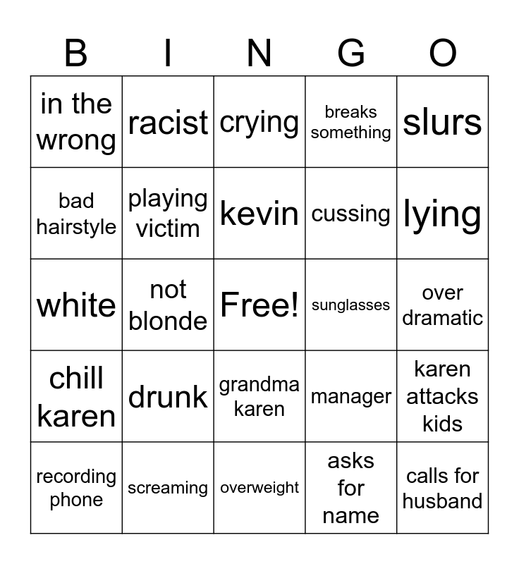 This bingo card has a free space and 24 words: drunk, screaming, kevin, recording phone, slurs, in the wrong, bad hairstyle, racist, sunglasses, grandma karen, cussing, white, manager, karen attacks kids, playing victim, asks for name, over dramatic, crying, lying, not blonde, calls for husband, chill karen, breaks something and overweight.