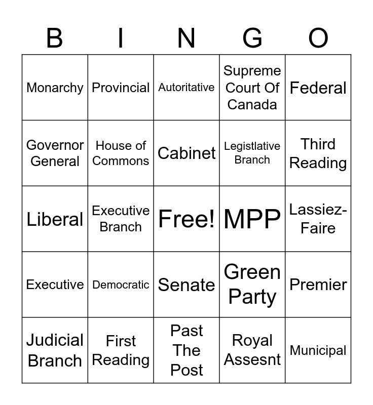 This bingo card has a free space and 25 words: Democratic, Past The Post, Cabinet, Judicial Branch, Federal, Monarchy, Governor General, Provincial, MPP, Senate, Legistlative Branch, Liberal, Green Party, Premier, House of Commons, Minority Government, Lassiez- Faire, Autoritative, Third Reading, Executive Branch, Municipal, First Reading, Executive, Supreme Court Of Canada and Royal Assesnt.