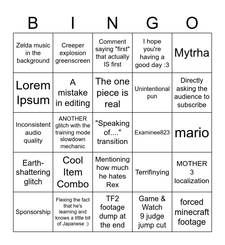 This bingo card has a free space and 24 words: Cool Item Combo, Flexing the fact that he's learning and knows a little bit of Japanese :), The one piece is real, Sponsorship, Mytrha, Zelda music in the background, Lorem Ipsum, Creeper explosion greenscreen, Examinee823, Mentioning how much he hates Rex, Unintentional pun, Inconsistent audio quality, Terrifinying, MOTHER 3 localization, A mistake in editing, Game & Watch 9 judge jump cut, mario, Comment saying "first" that actually IS first, Directly asking the audience to subscribe, ANOTHER glitch with the training mode slowdown mechanic, forced minecraft footage, Earth-shattering glitch, I hope you're having a good day :3 and TF2 footage dump at the end.
