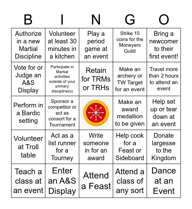This bingo card has a free space and 24 words: Act as a list runner for a Tourney, Enter an A&S Display, Retain for TRMs or TRHs, Teach a class at an event, Bring a newcomer to their first event!, Authorize in a new Martial Discipline, Vote for or Judge an A&S Display, Volunteer at least 30 minutes in a kitchen, Make an award medallion to be given, Write someone in for an award, Make an archery or TW Target for an event, Perform in a Bardic setting, Help cook for a Feast or Sideboard, Donate largesse to the Kingdom, Participate in Martial activities outside of your primary discipline(s), Attend a class of any sort, Help set up or tear down at an event, Play a period game at an event, Travel more than 2 hours to attend an event, Sponsor a competitor or act as consort for a Tournament, Dance at an Event, Volunteer at Troll table, Strike 10 coins for the Moneyers Guild and Attend a Feast.