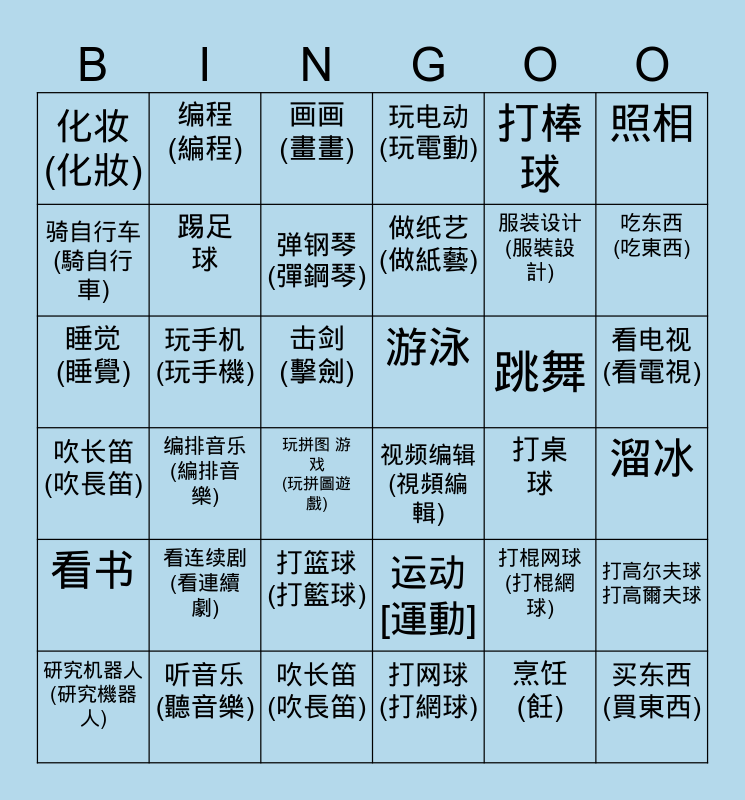 This bingo card has 36 words: 运动 [運動], 打篮球 (打籃球), 打网球 (打網球), 骑自行车 (騎自行車), 吹长笛 (吹長笛), 游泳, 踢足球, 吹长笛 (吹長笛), 打棒球, 打棍网球 (打棍網球), 吃东西 (吃東西), 玩电动 (玩電動), 打高尔夫球 打高爾夫球, 玩手机 (玩手機), 做纸艺(做紙藝), 化妆(化妝), 看书, 跳舞, 睡觉 (睡覺), 画画 (畫畫), 击剑 (擊劍), 编排音乐 (編排音樂), 视频编辑 (視頻編輯), 玩拼图 游 戏 (玩拼圖遊戲), 打桌球, 编程 (編程), 服装设计 (服裝設計), 听音乐 (聽音樂), 弹钢琴 (彈鋼琴), 照相, 买东西 (買東西), 研究机器人 (研究機器人), 溜冰, 看电视 (看電視), 看连续剧 (看連續劇) and 烹饪(飪).