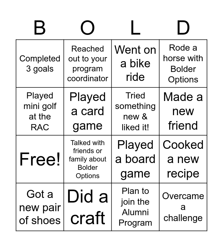 This bingo card has 20 words: Cooked a new recipe, Went on a 1 mile hike, Went on a bike ride, Played basketball at the RAC, Got a new pair of shoes, Played mini golf at the RAC, Did a craft, Completed 3 goals, Free!, Reached out to your program coordinator, Talked with friends or family about Bolder Options, Played a board game, Played a card game, Overcame a challenge, Tried something new & liked it!, Read a book with your mentor/mentee, Made a new friend, Rode a horse with Bolder Options, Plan to join the Alumni Program and Went to the Glow-in-the-dark hike event.
