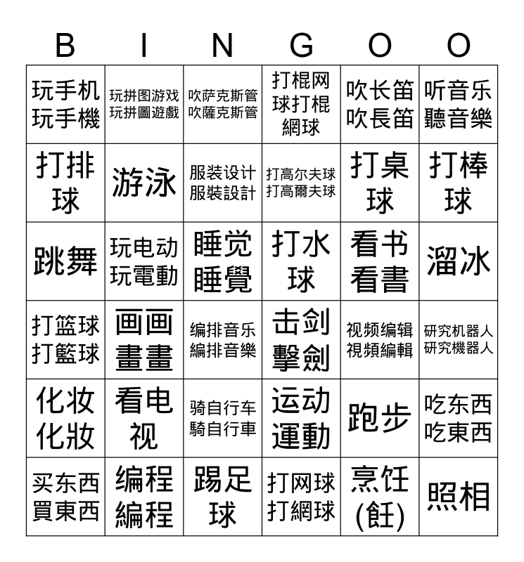This bingo card has 36 words: 运动 運動, 骑自行车 騎自行車, 打网球 打網球, 打排球, 打篮球 打籃球, 打水球, 游泳, 踢足球, 吹长笛 吹長笛, 跑步, 打棒球, 打棍网球打棍網球, 吃东西 吃東西, 玩电动 玩電動, 打高尔夫球 打高爾夫球, 玩手机 玩手機, 化妆化妝, 看书 看書, 跳舞, 吹萨克斯管 吹薩克斯管, 睡觉 睡覺, 画画 畫畫, 击剑 擊劍, 编排音乐 編排音樂, 视频编辑 視頻編輯, 玩拼图游戏 玩拼圖遊戲, 打桌球, 编程 編程, 服装设计 服裝設計, 听音乐 聽音樂, 照相, 买东西 買東西, 研究机器人 研究機器人, 溜冰, 看电视 and 烹饪(飪).