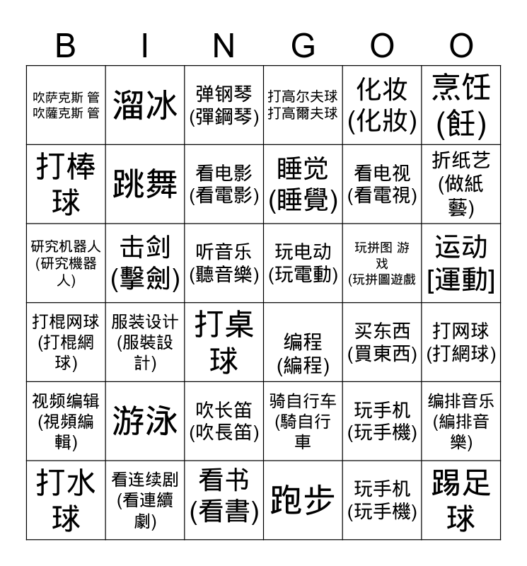 This bingo card has 36 words: 骑自行车 (騎自行車, 吹长笛 (吹長笛), 跑步, 打棒球, 打棍网球 (打棍網球), 玩电动 (玩電動), 跳舞, 看书 (看書), 化妆(化妝), 玩手机 (玩手機), 折纸艺(做紙 藝), 打高尔夫球 打高爾夫球, 编排音乐 (編排音樂), 击剑 (擊劍), 睡觉 (睡覺), 吹萨克斯 管 吹薩克斯 管, 视频编辑 (視頻編輯), 玩拼图 游 戏 (玩拼圖遊戲, 研究机器人 (研究機器人), 弹钢琴 (彈鋼琴), 听音乐 (聽音樂), 服装设计 (服裝設計), 编程 (編程), 打桌球, 买东西 (買東西), 溜冰, 看电视 (看電視), 看连续剧 (看連續劇), 看电影 (看電影), 烹饪(飪), 踢足球, 打水球, 打网球 (打網球), 运动 [運動], 游泳 and 玩手机 (玩手機).