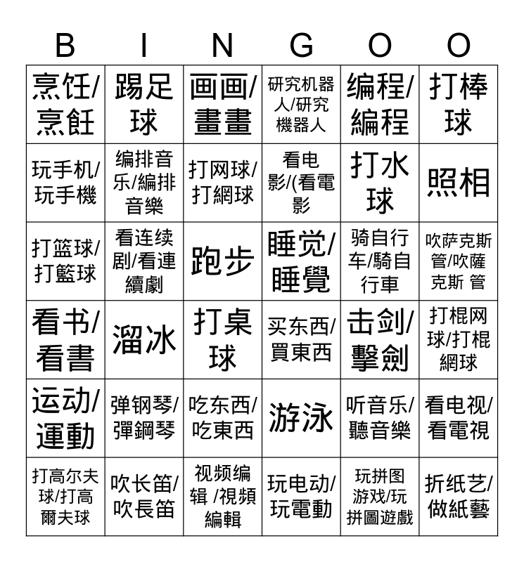 This bingo card has 36 words: 游泳, 吃东西/吃東西, 玩电动/玩電動, 玩手机/玩手機, 看书/看書, 睡觉/睡覺, 编排音乐/編排音樂, 视频编辑 /視頻編輯, 编程/編程, 听音乐/聽音樂, 照相, 研究机器人/研究機器人, 看电视/看電視, 看连续剧/看連續劇, 看电影/(看電影, 烹饪/烹飪, 运动/運動, 骑自行车/騎自行車, 打篮球/打籃球, 画画/畫畫, 跑步, 溜冰, 买东西/買東西, 打桌球, 击剑/擊劍, 踢足球, 打水球, 吹长笛/吹長笛, 打网球/打網球, 打棒球, 折纸艺/做紙藝, 打高尔夫球/打高爾夫球, 打棍网球/打棍網球, 吹萨克斯管/吹薩克斯 管, 弹钢琴/彈鋼琴 and 玩拼图 游戏/玩拼圖遊戲.
